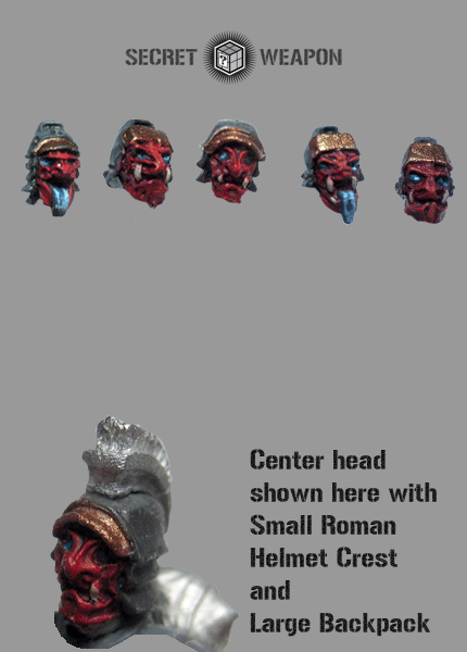 A set of five Oni Mask head swaps with helmets cast in soft metal for use with 25-30mm heroic scale miniatures. The back of each head includes straps attached to a ring.