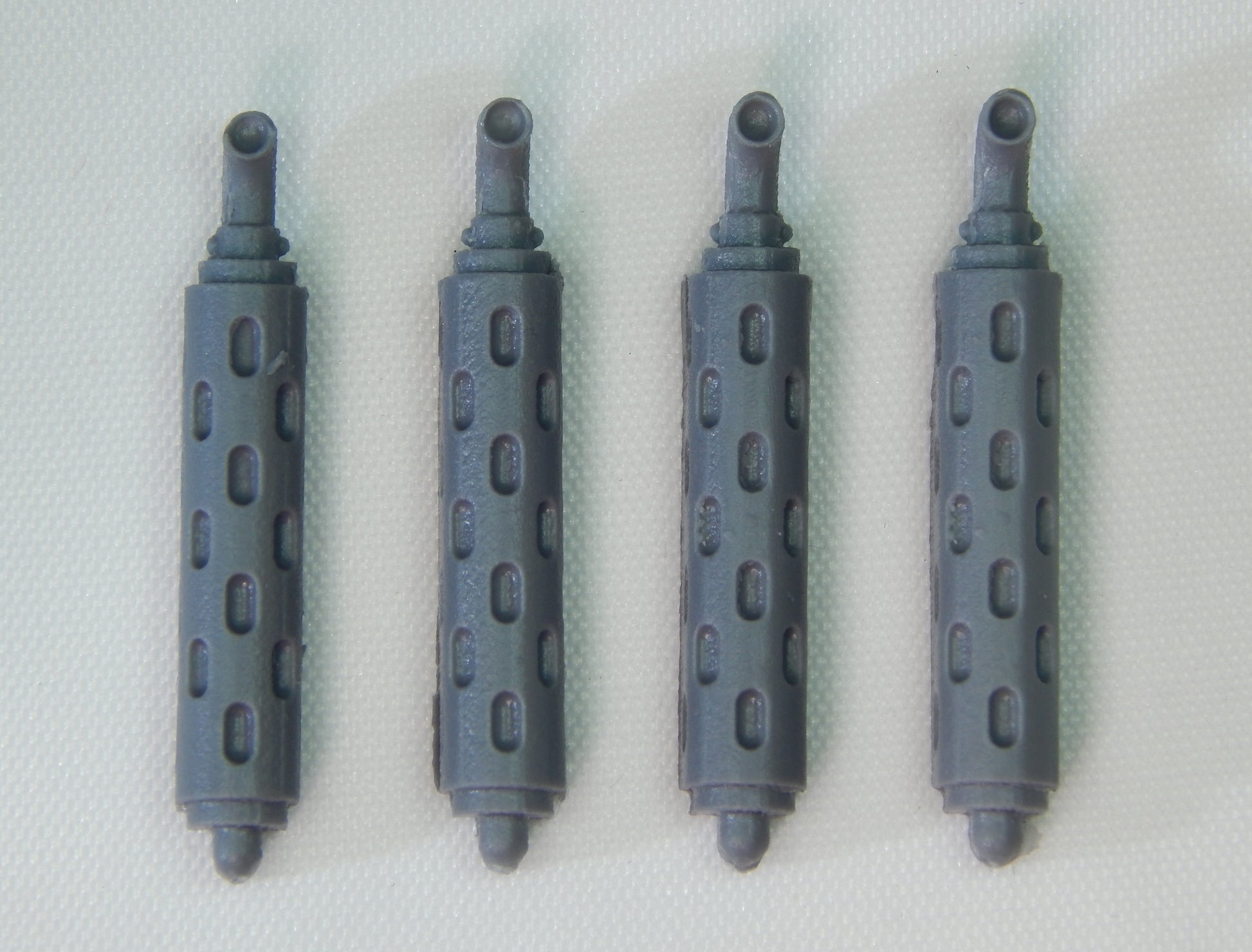 The Rear-facing Small Exhaust Pipes is a set of four (4) pieces each 1.2 inches (29mm) tall and 0.2 inches (5mm) wide. All nozzles face rearward. This set is compatiable with the Games Workshop MKI Rhino plastic model.