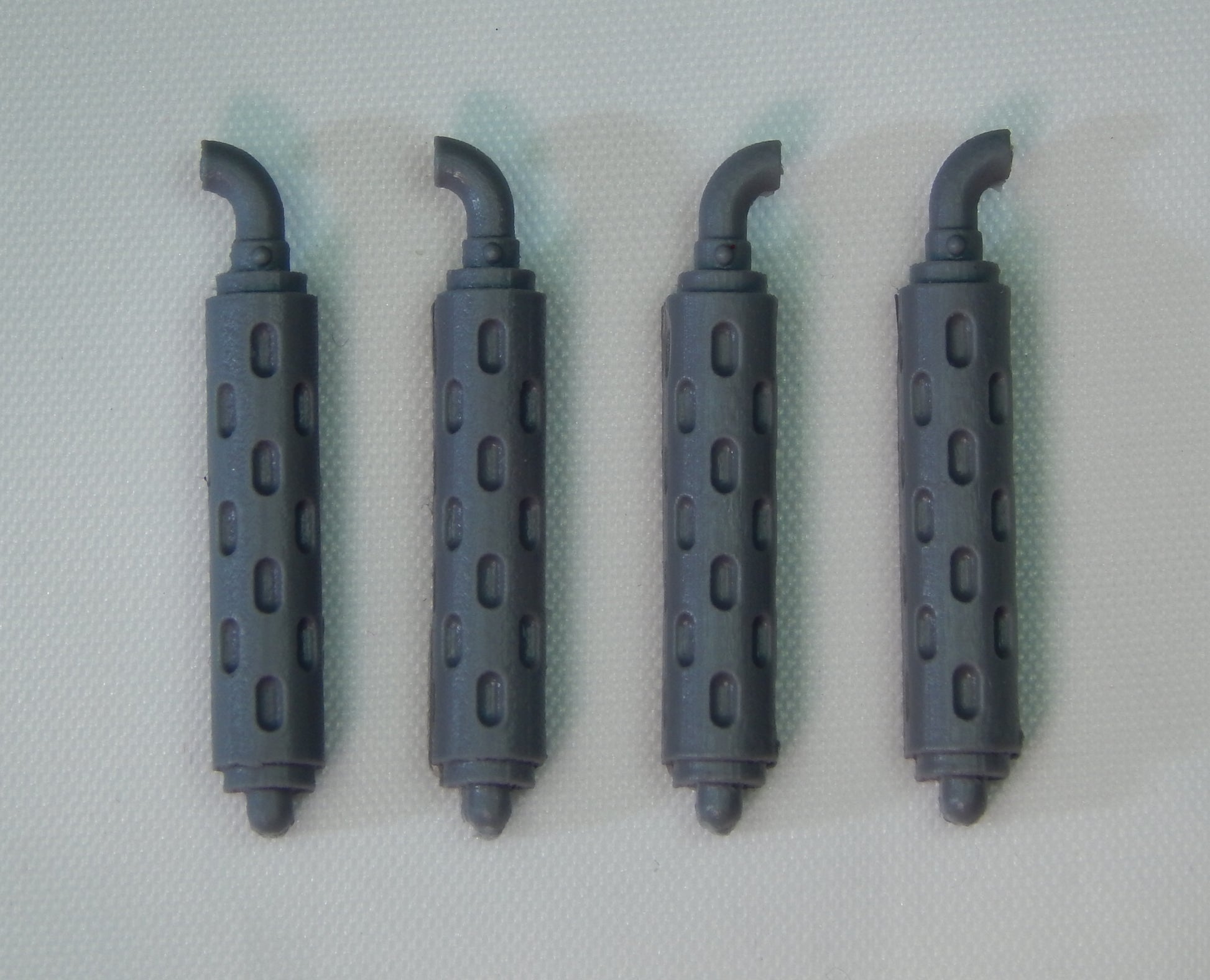 The Rear-facing Small Exhaust Pipes is a set of four (4) pieces each 1.2 inches (29mm) tall and 0.2 inches (5mm) wide. All nozzles face rearward. This set is compatiable with the Games Workshop MKI Rhino plastic model.
