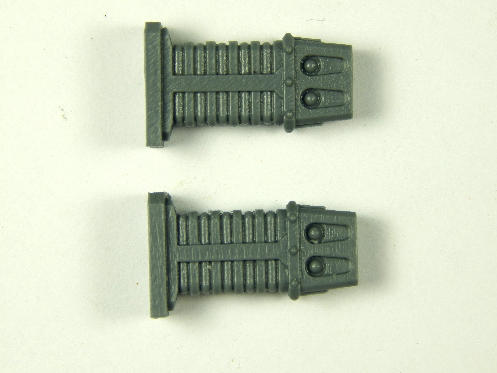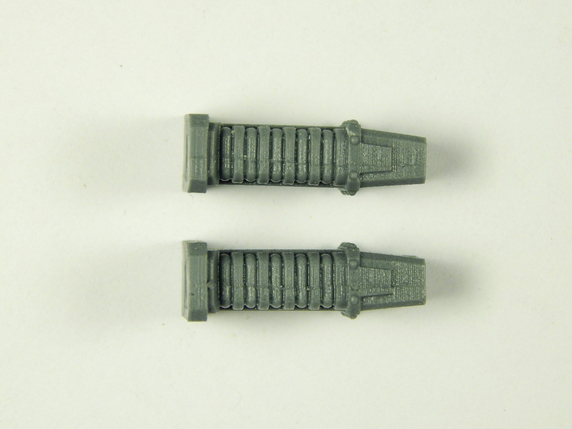 This set consists of two (2) cannons each 0.8 inches (21mm) long mounted on a 0.45 inches (10mm) tall by 0.25 inches (6mm) wide base. The mount can also accommodate a 1/8 inch diameter by 1/16 inch thick magnet allowing easy swapping between weapons.