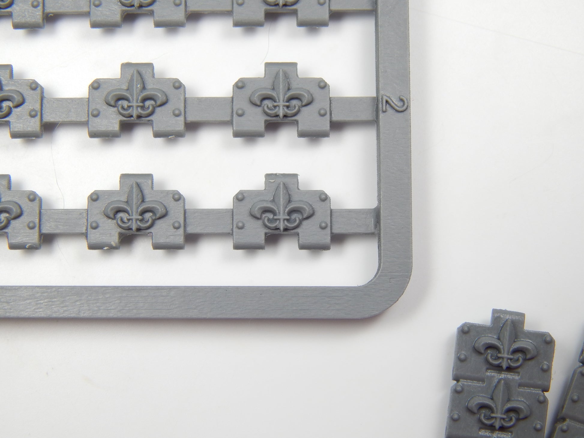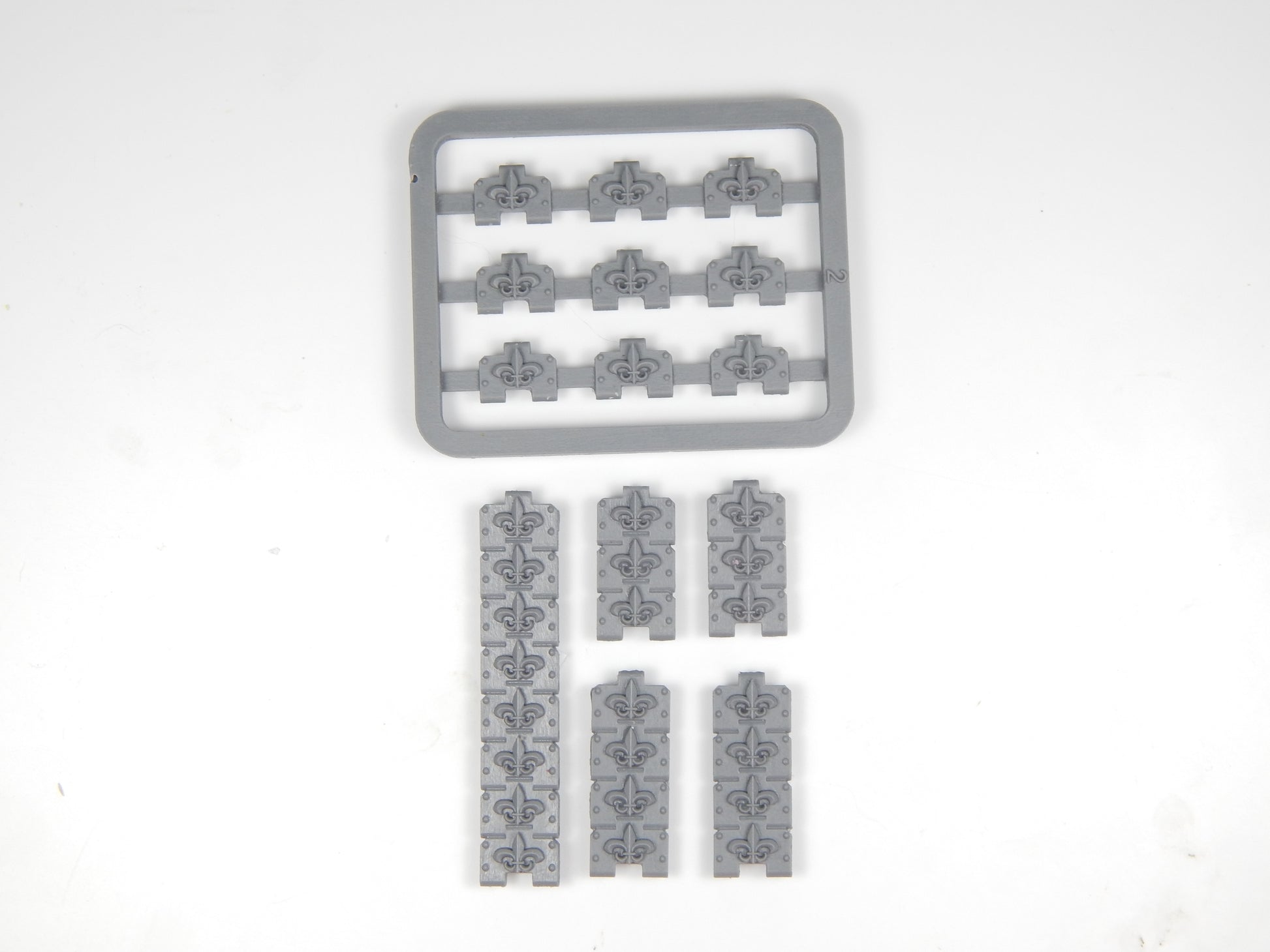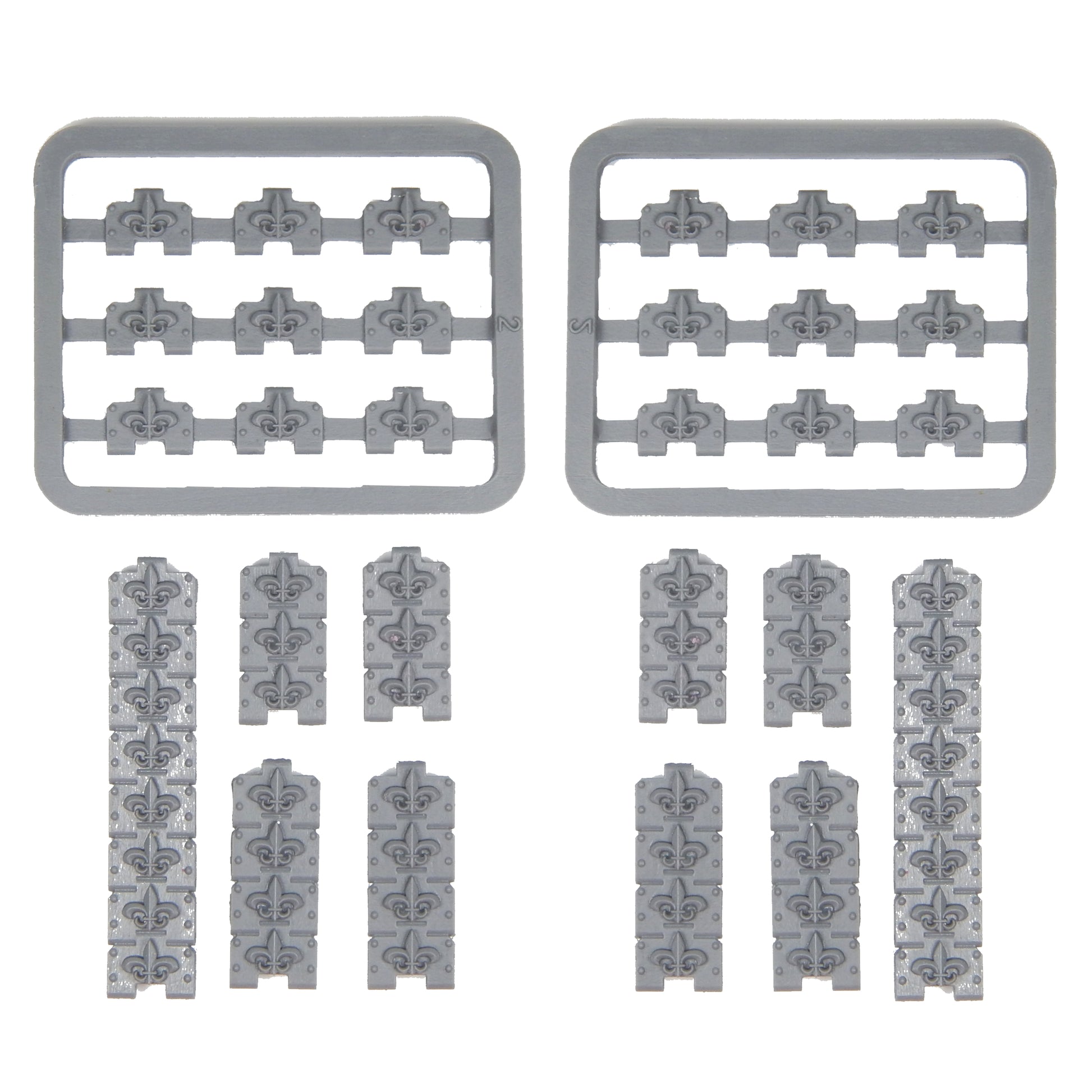 The Fleur De Lis Pattern 040 Tank Treads is a set of replacement treads for Games workshop MKII Rhino plastic kit. The kit consists of four 3-link sections, four 4-link sections, two 8-link sections, and 18 individual treads.