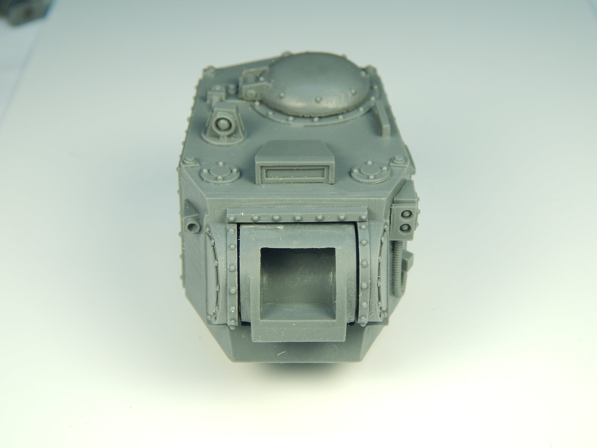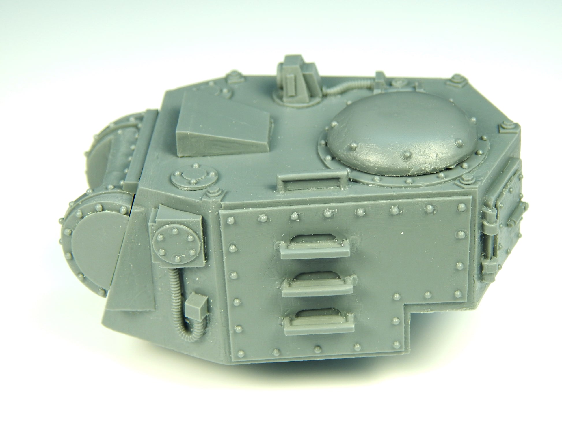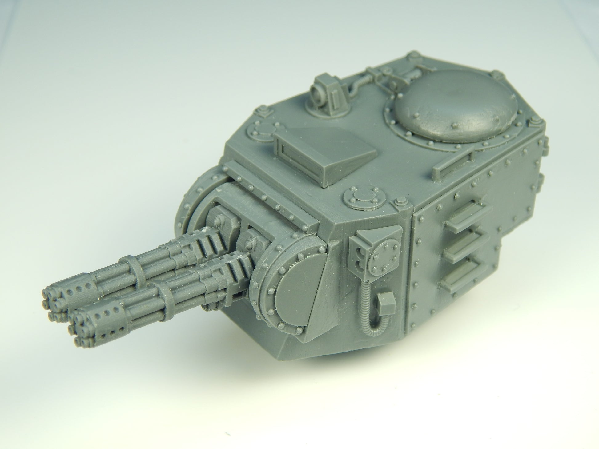 The Kolossus Dual Weapon Turret is a seven (7) piece kit that includes the turret, hatch, and weapon mounts. The turret can use any Blood & Skulls Industry Light or Medium Weapon Sets and the weapon mount is pre-drilled for 1/8 inch diameter by 1/16 inch magnets. It is compatiable with Games Workshop Leman Russ plastic model.
