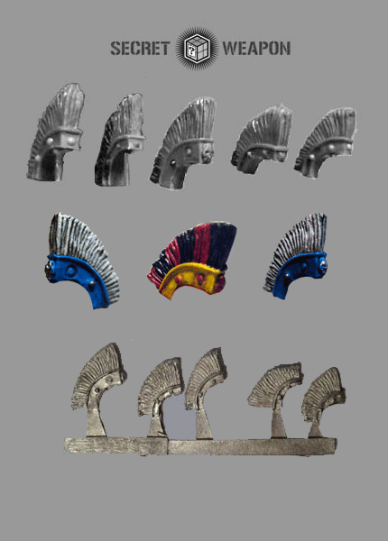 A set of five large Roman style helmet crests cast in soft metal for use with 25-30mm heroic scale miniatures.