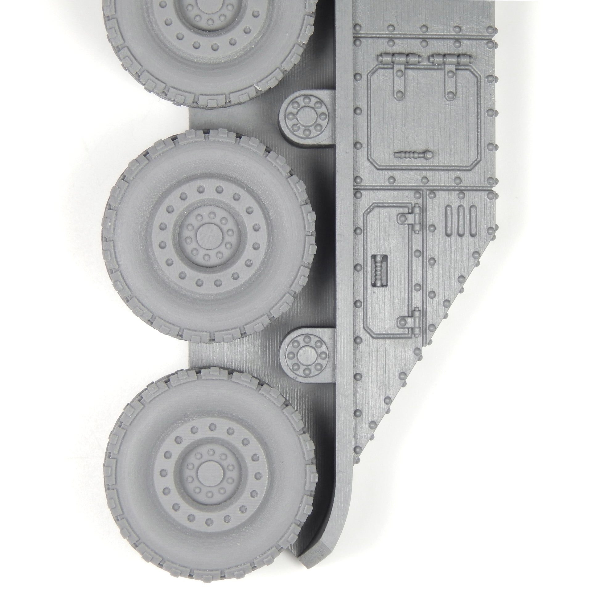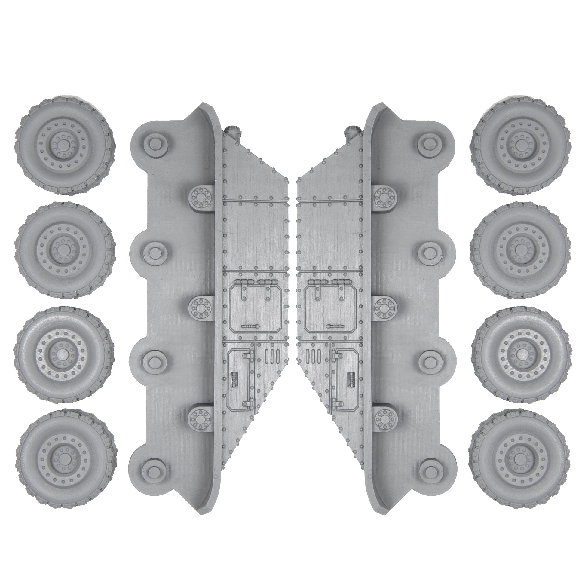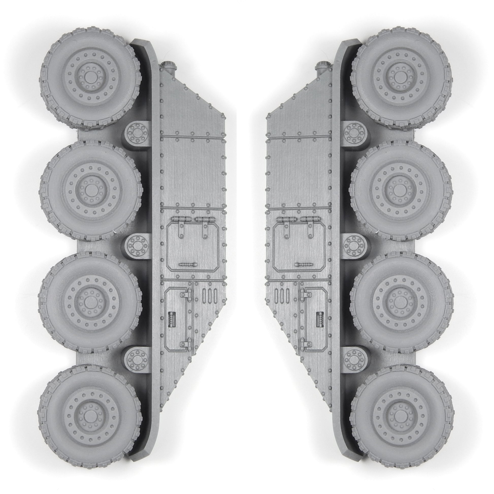 This Libra 8x8 Wheeled Conversion Kit comes with two custom side pieces and eight (8) Large Wheels. This kit is compatible with the Games Workshop Leman Russ plastic model.