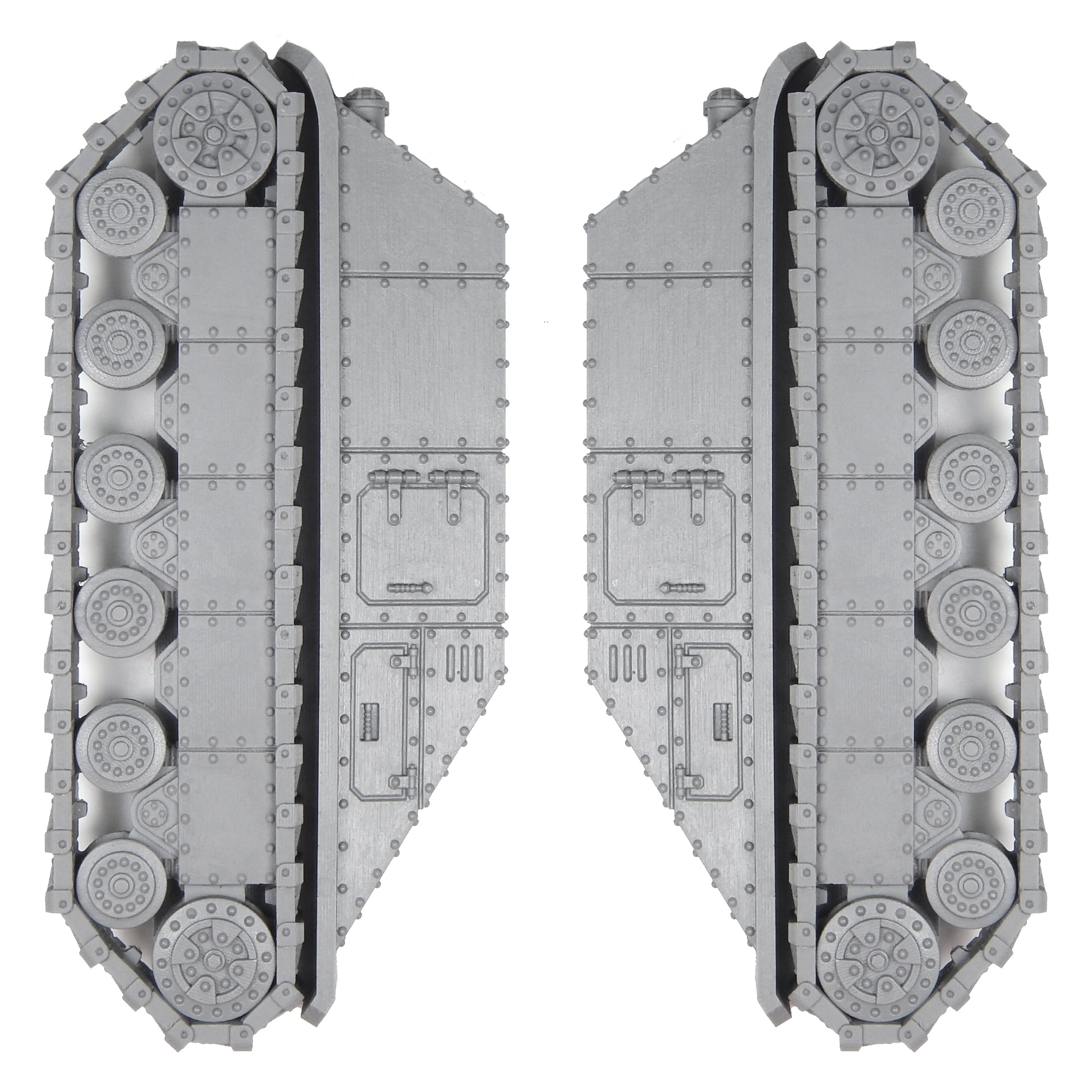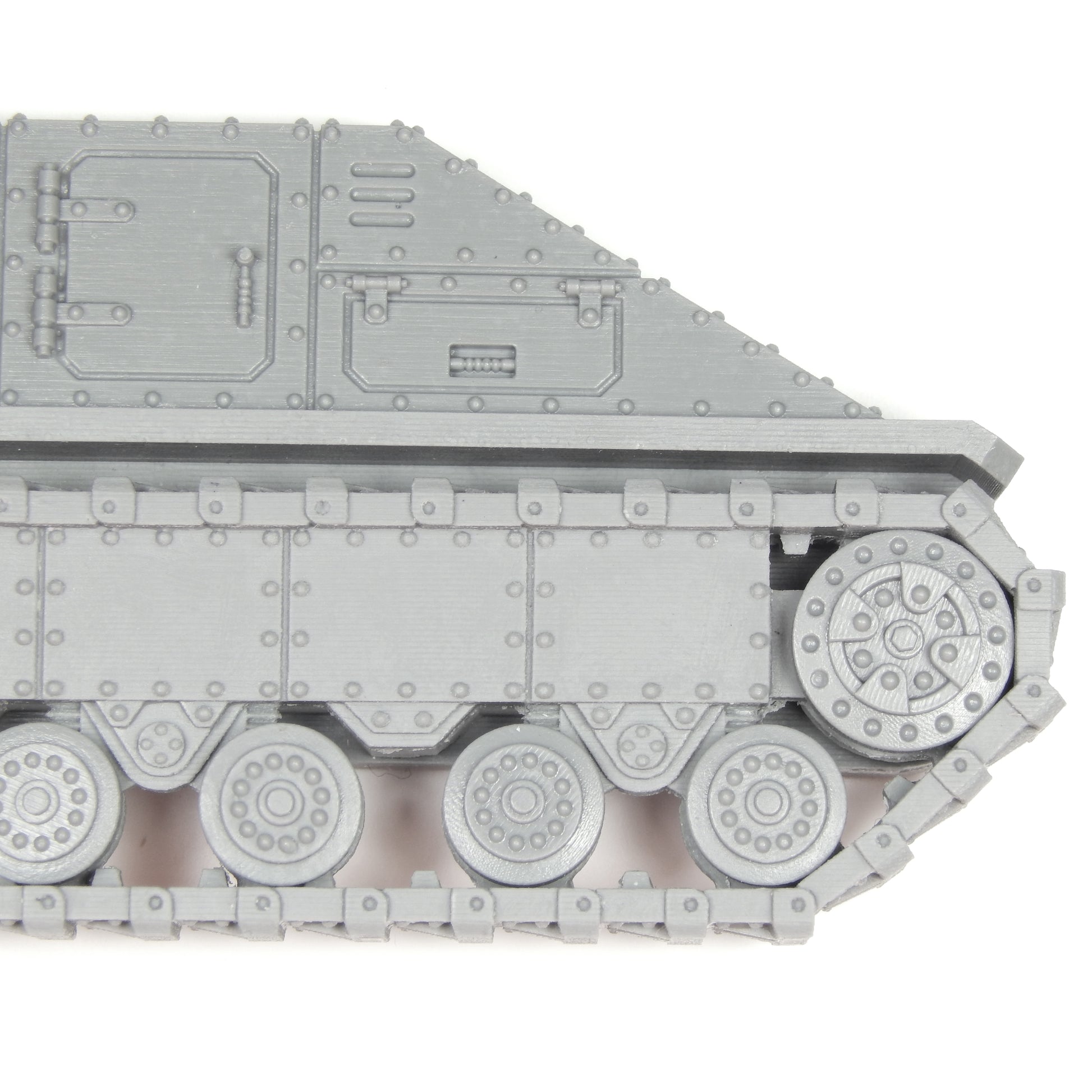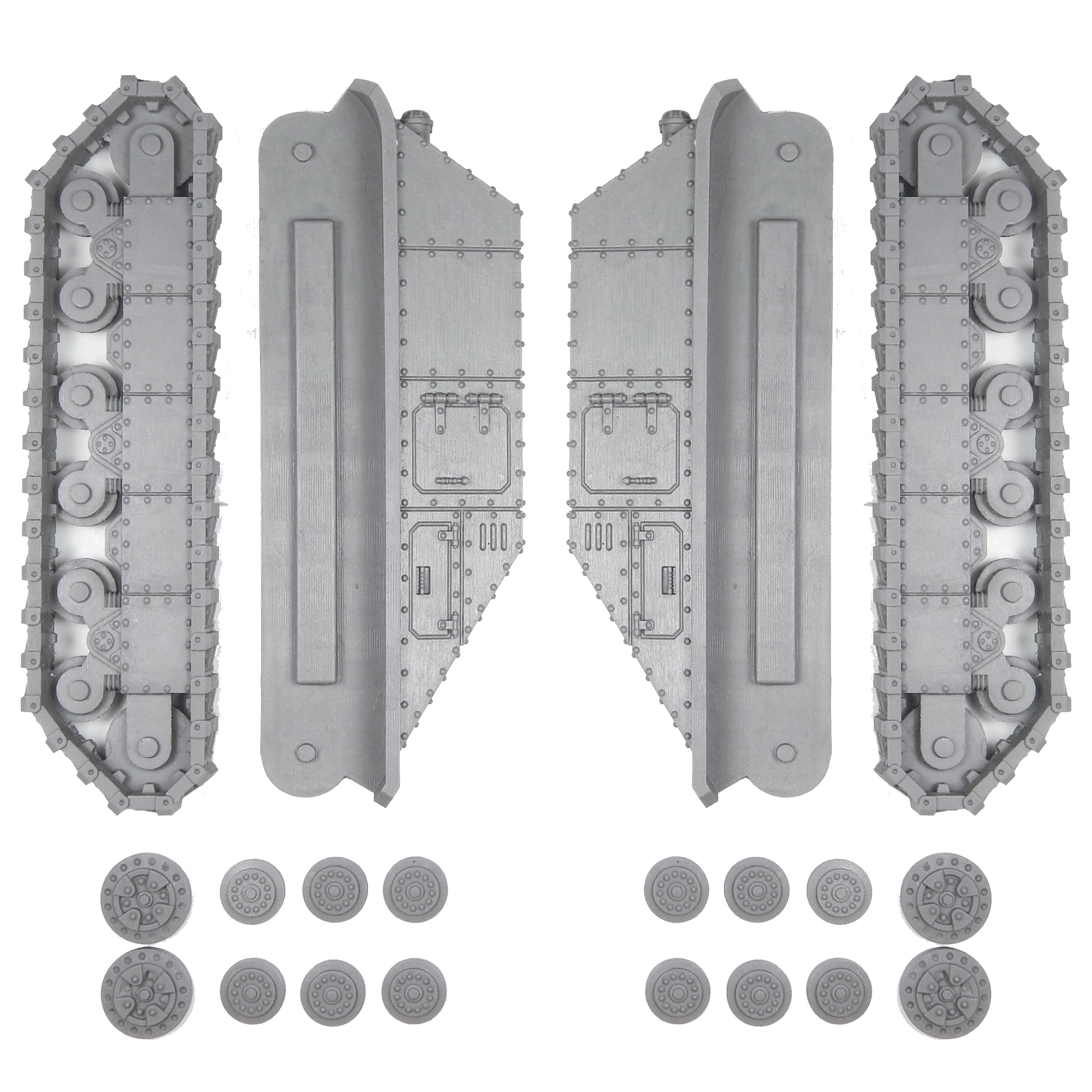 This Aquarius Full-Track Wheeled Conversion Kit comes with two custom side and two (2) full-track sections each with eight (8) separate road wheels. This kit is compatible with the Games Workshop Leman Russ plastic model.