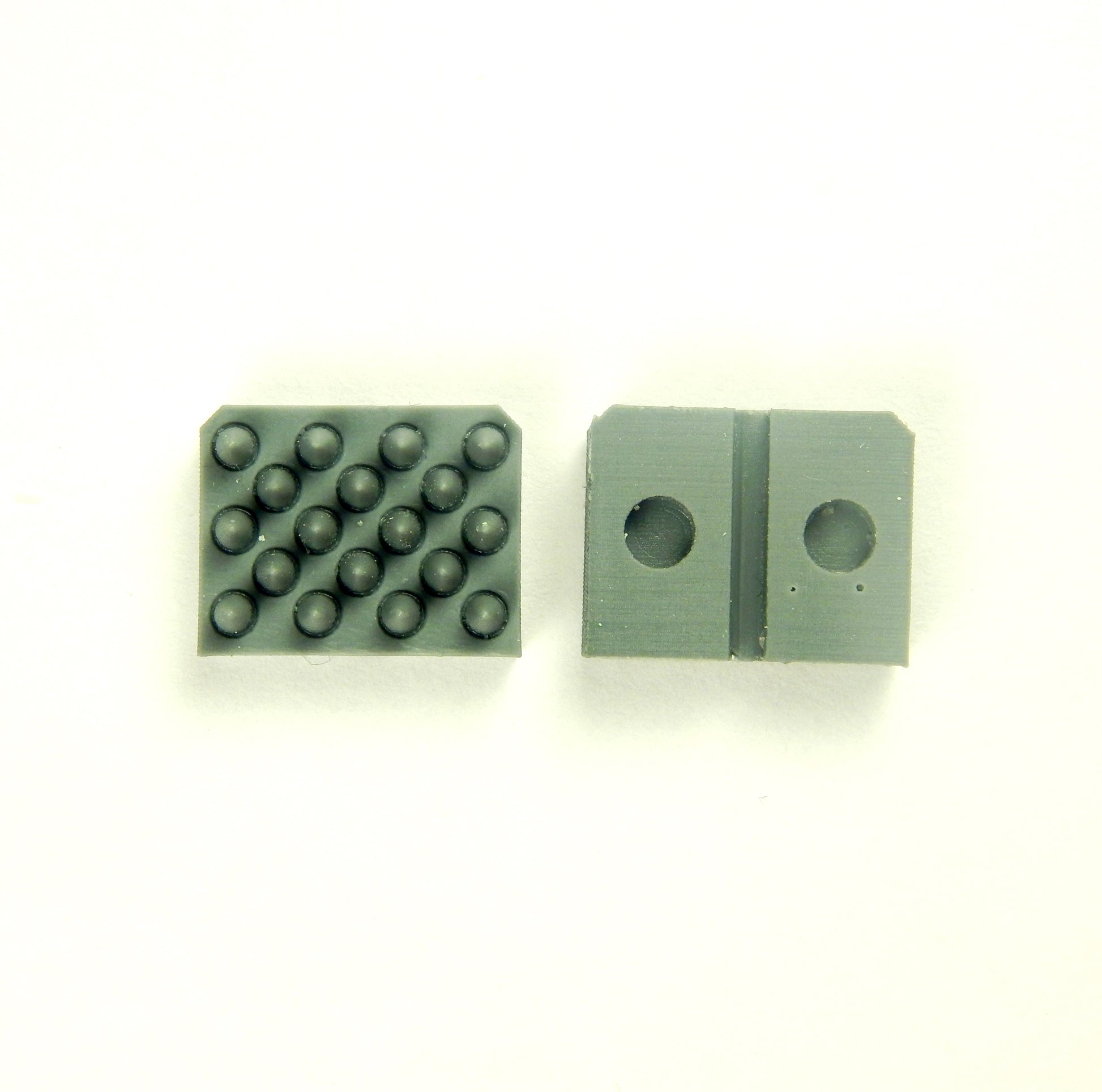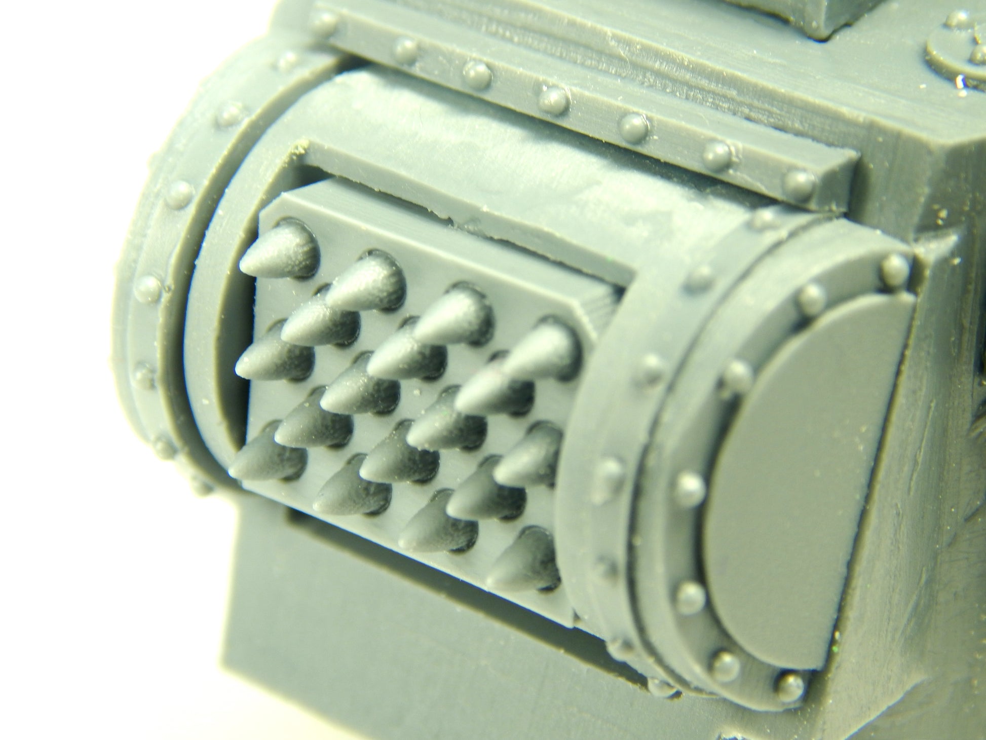 This single piece set consists of a rack of missiles 0.2 inches (6mm) thick mounted on a 0.45 inches (10mm) tall by 0.58 inches (15mm) wide base. The mount can also accommodate two 1/8 inch diameter by 1/16 inch thick magnet allowing easy swapping between weapons.