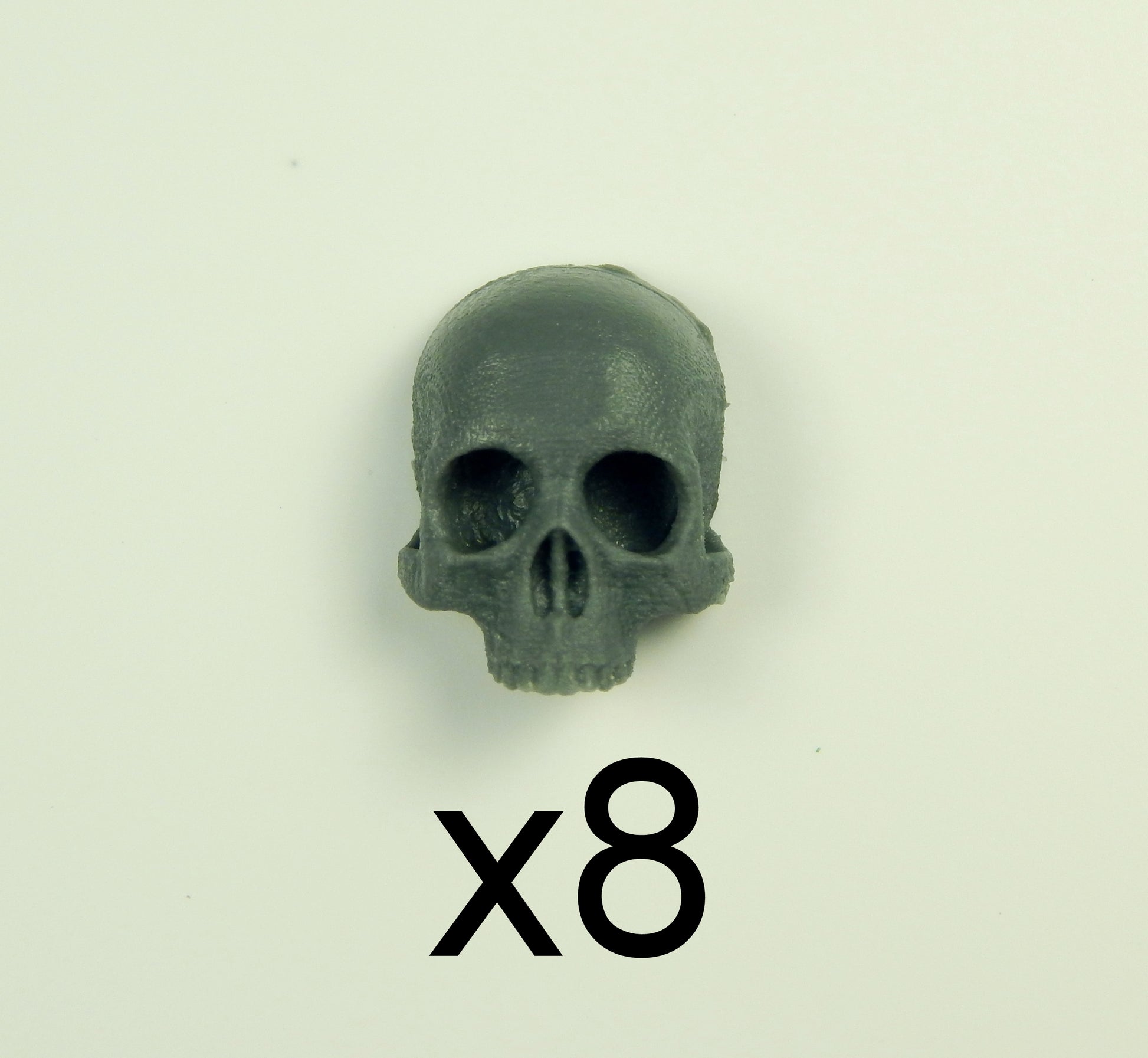The Large Mounting Skulls 2 pack contains eight (8) skulls each 0.5 inches (12mm) high and 0.4 inches (11mm) wide with a flat back.