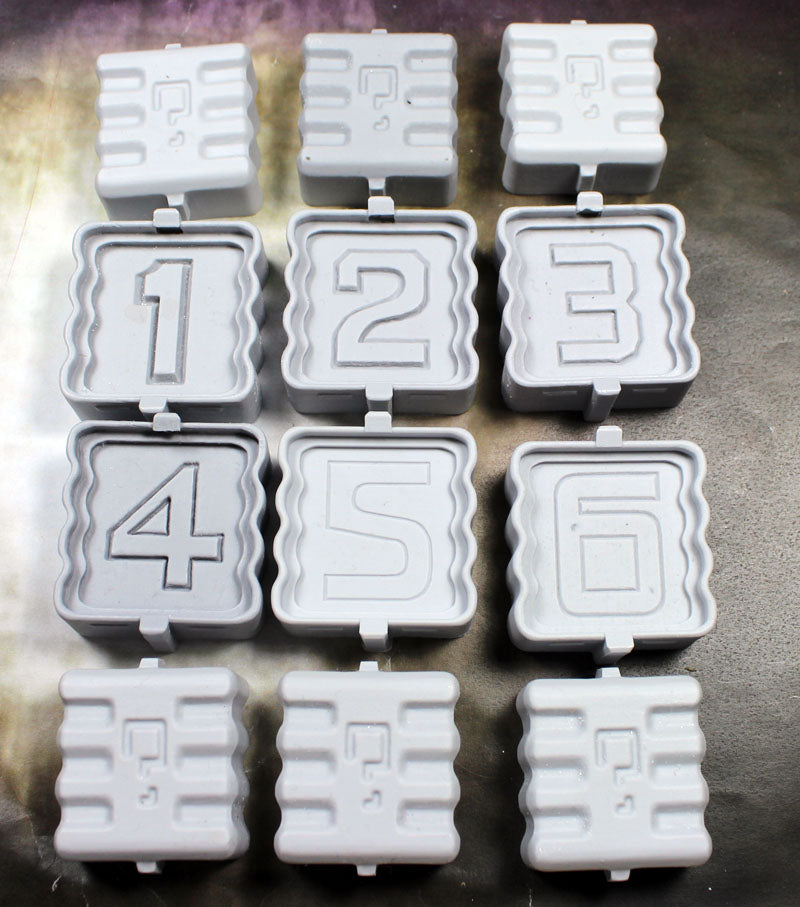 A set of six two part "mystery objective" markers made up of a box containing the numbers 1 to 6 and a lid to hide them for random reveals during the game. This product is sold unpainted and should be washed in cool, soapy water prior to painting. Master sculpt by Eric Hedman