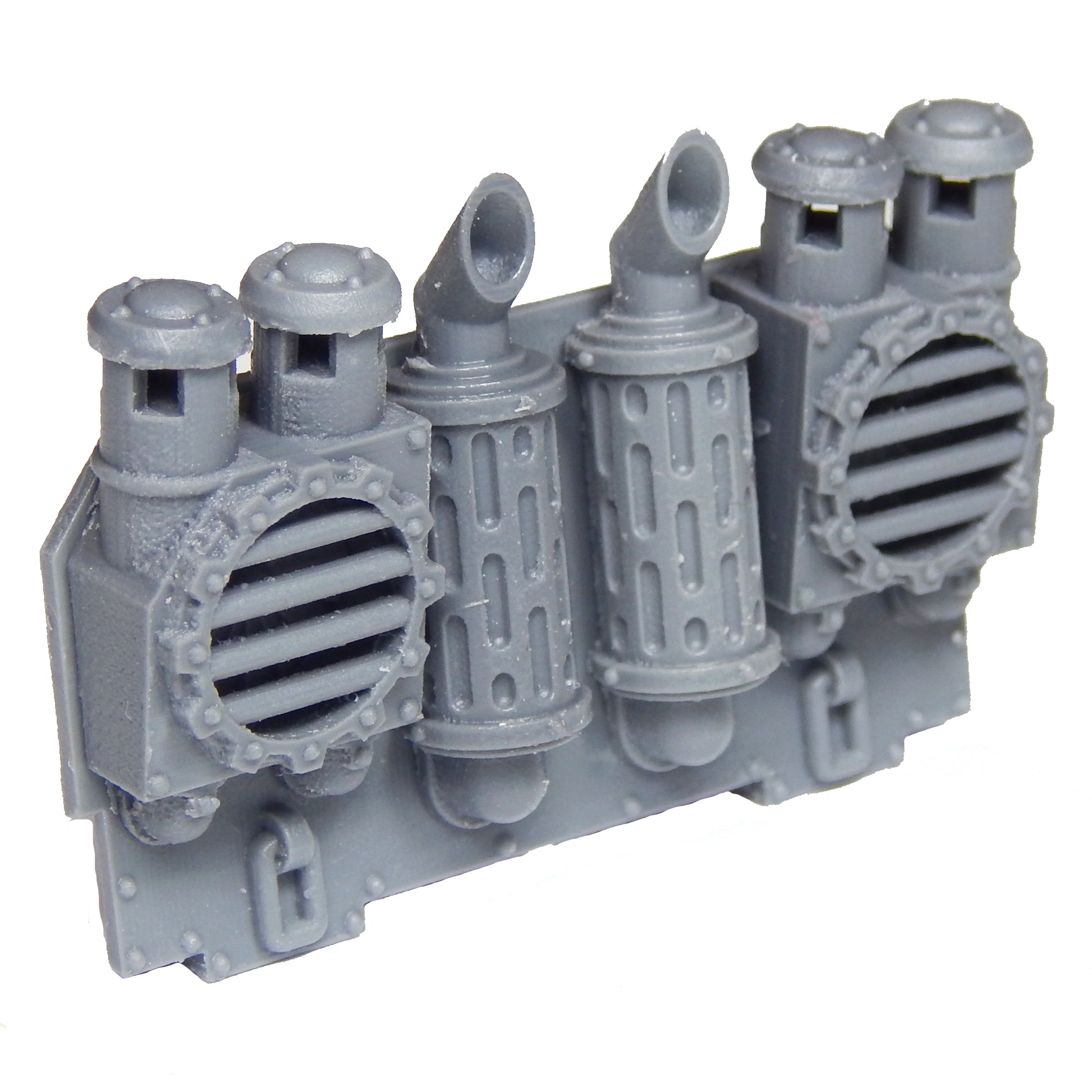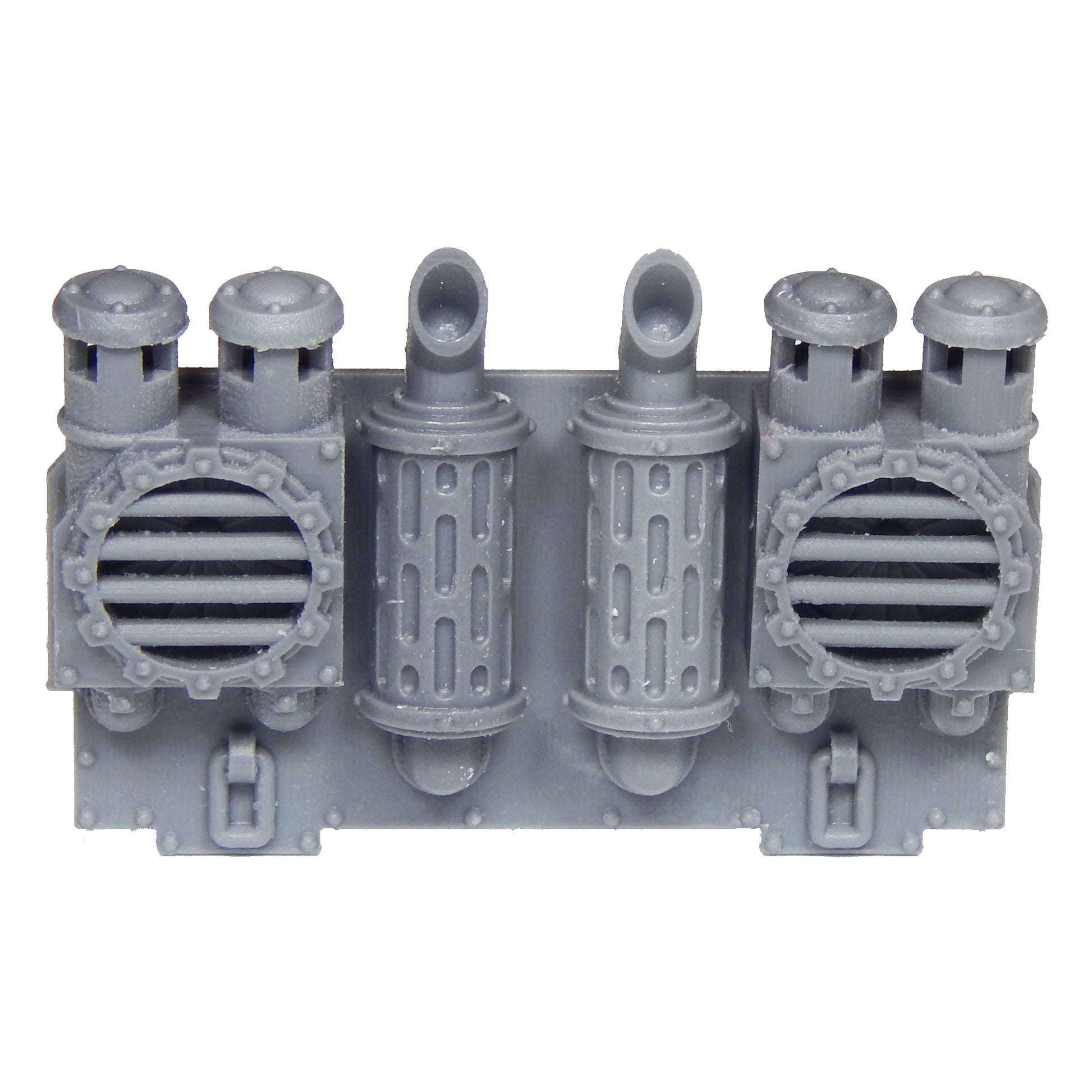 The Rear Engine Plate with Air Filters is a multi-piece set and is fully compatible with the Games Workshop Leman Russ Battle Tank.