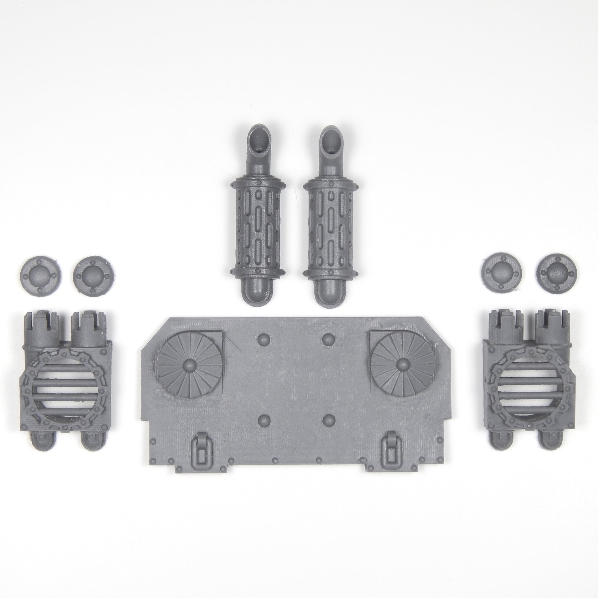 This set consists of a rear panel, two air filters with four caps, and two exhaust pipes. When assembled the Rear Engine Plate is 1.9 inches wide (48mm), 0.3 inches deep (8mm), and 1.1 inches tall (28mm).