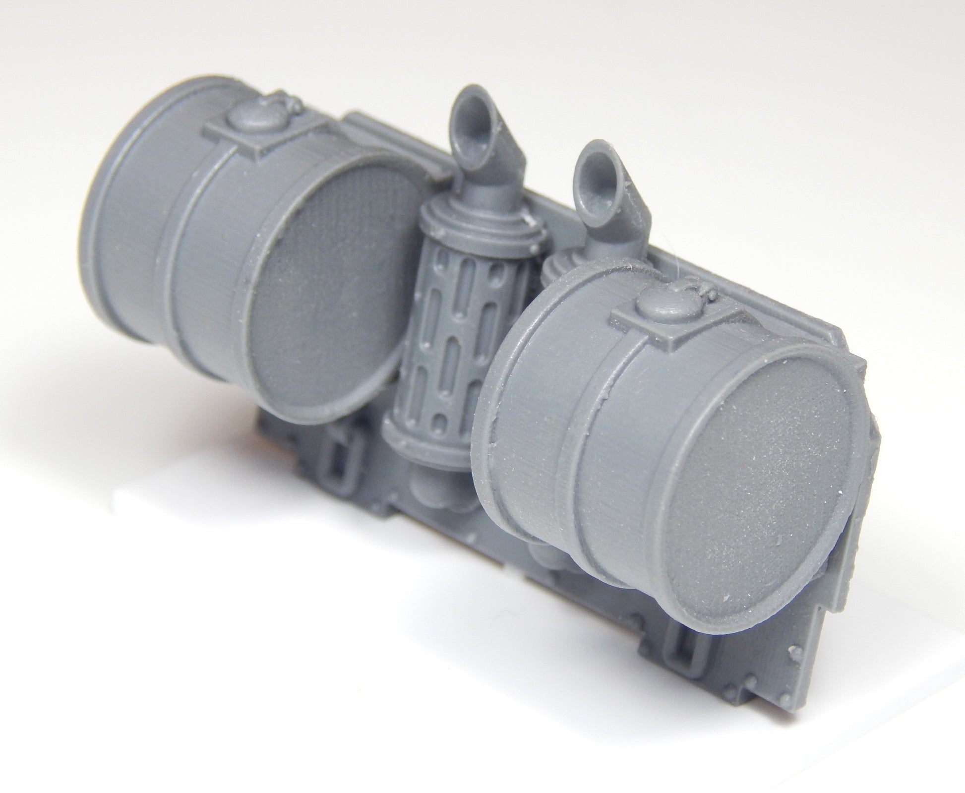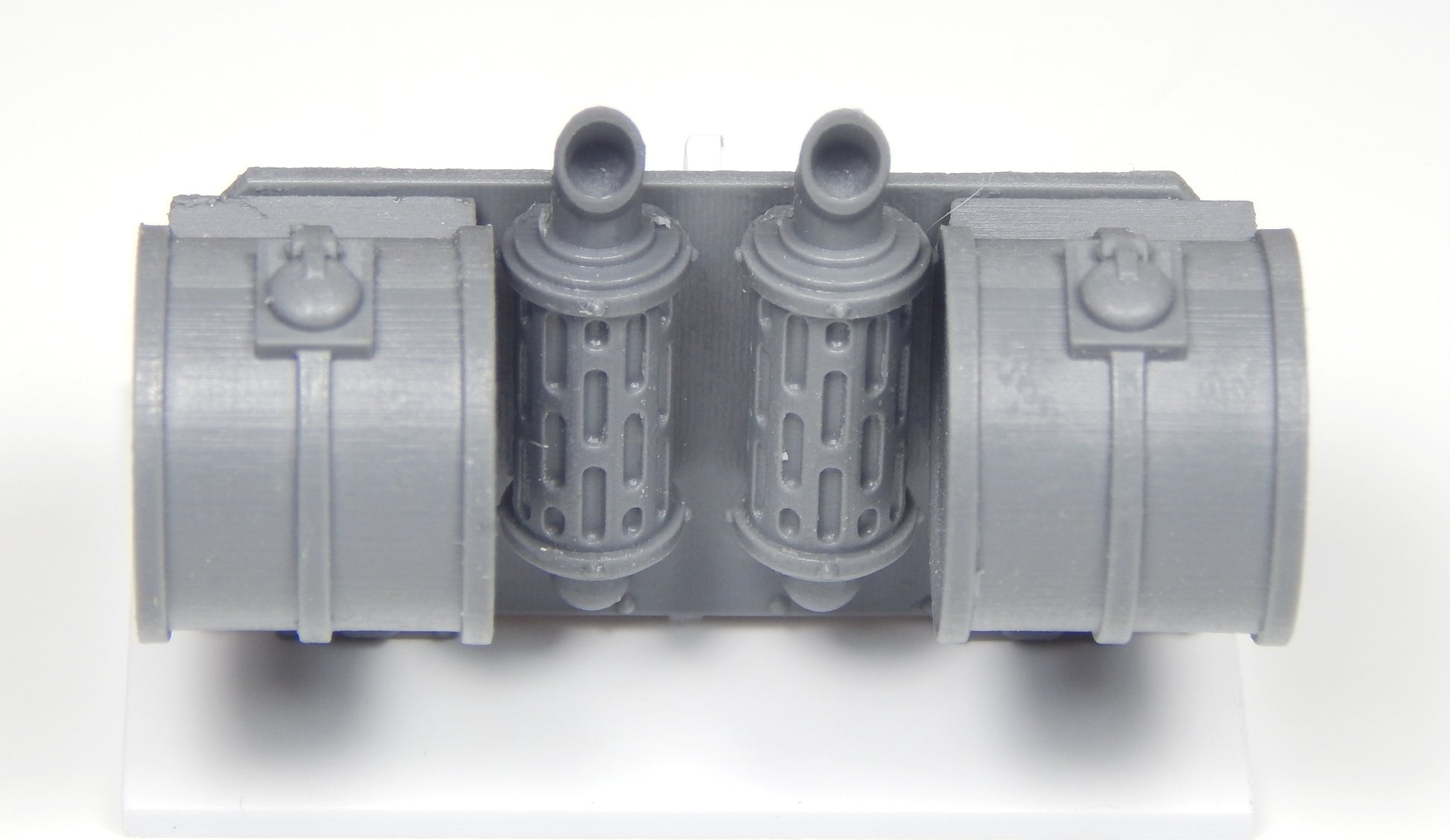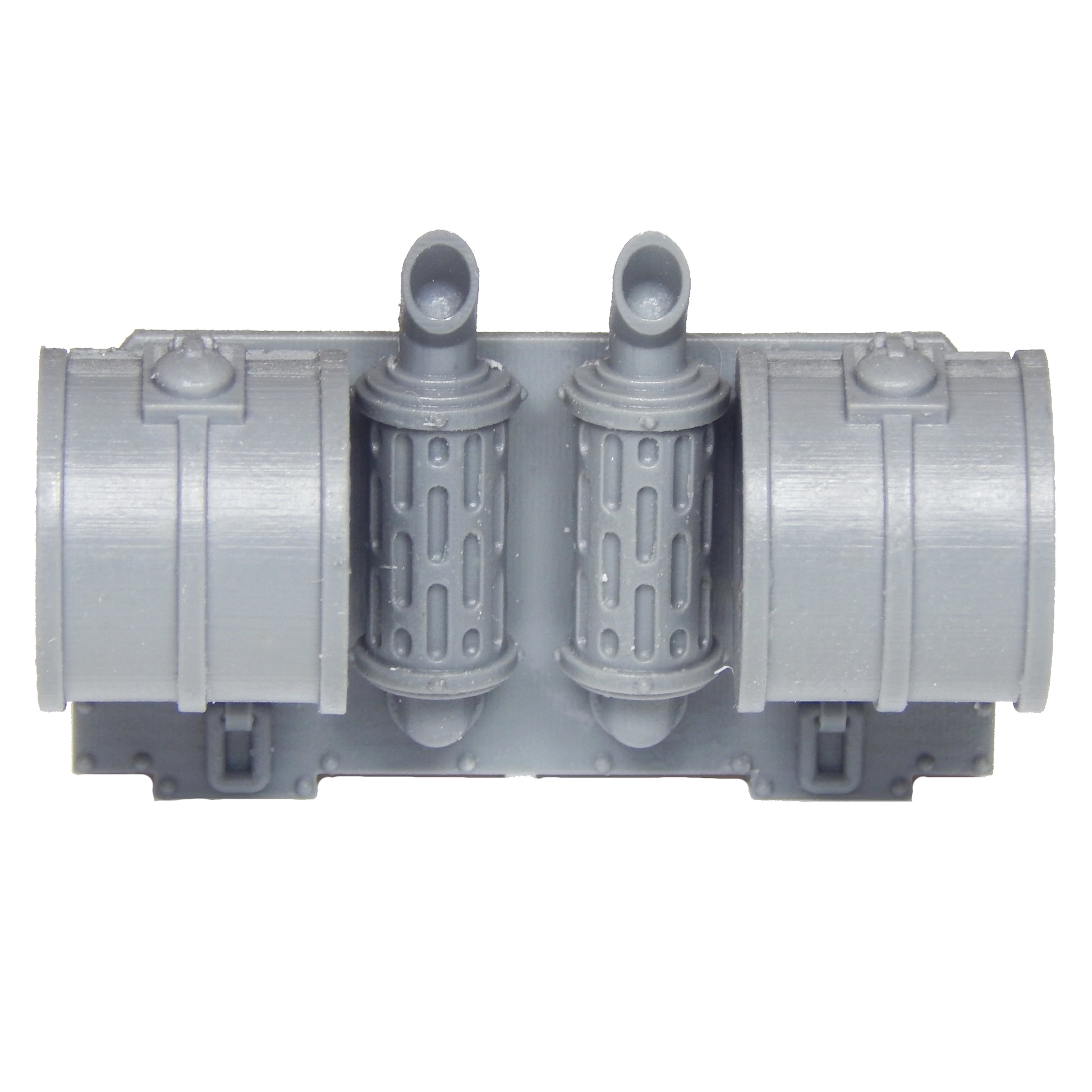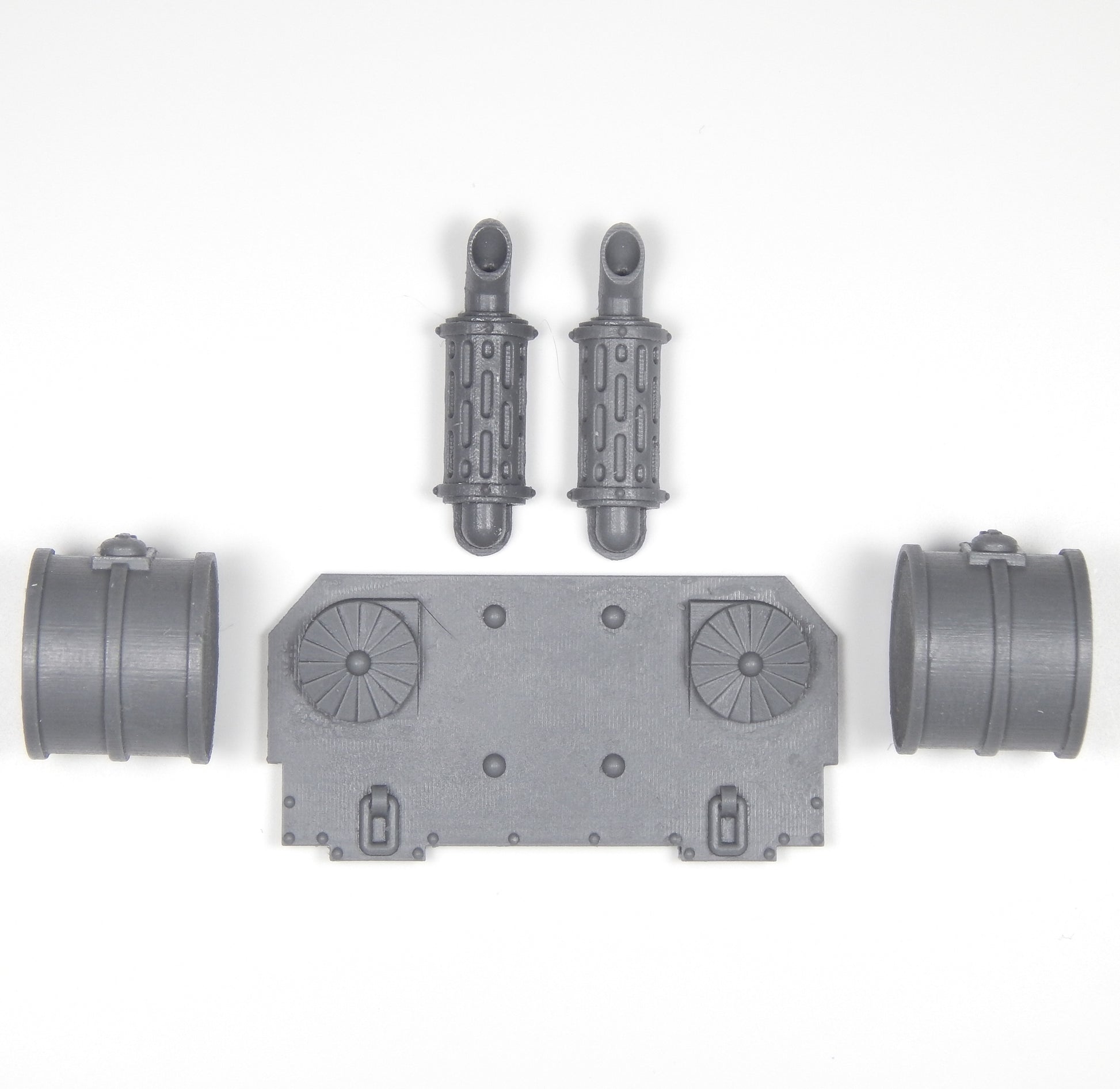 This set consists of a rear panel, two Fuel Tank B's, and two (2) exhaust pipes. When assembled the Rear Engine Plate is 1.9 inches wide (48mm), 0.3 inches deep (8mm), and 1.1 inches tall (28mm).