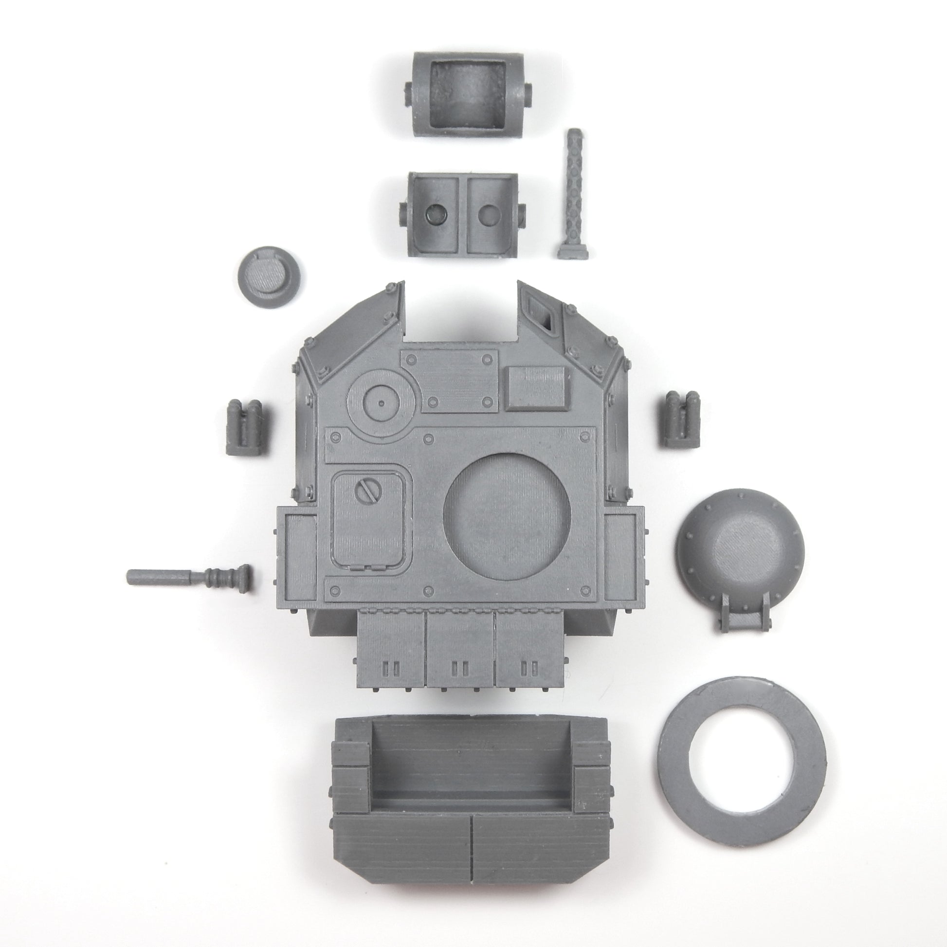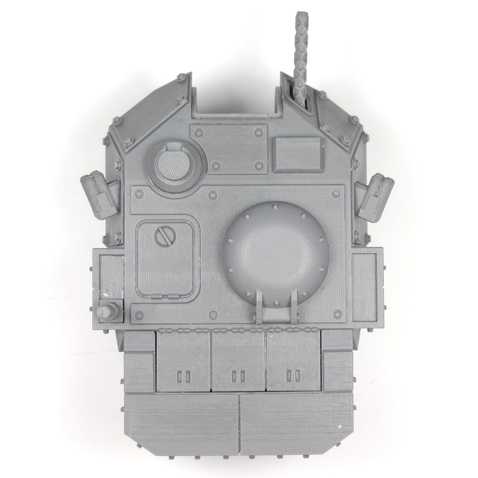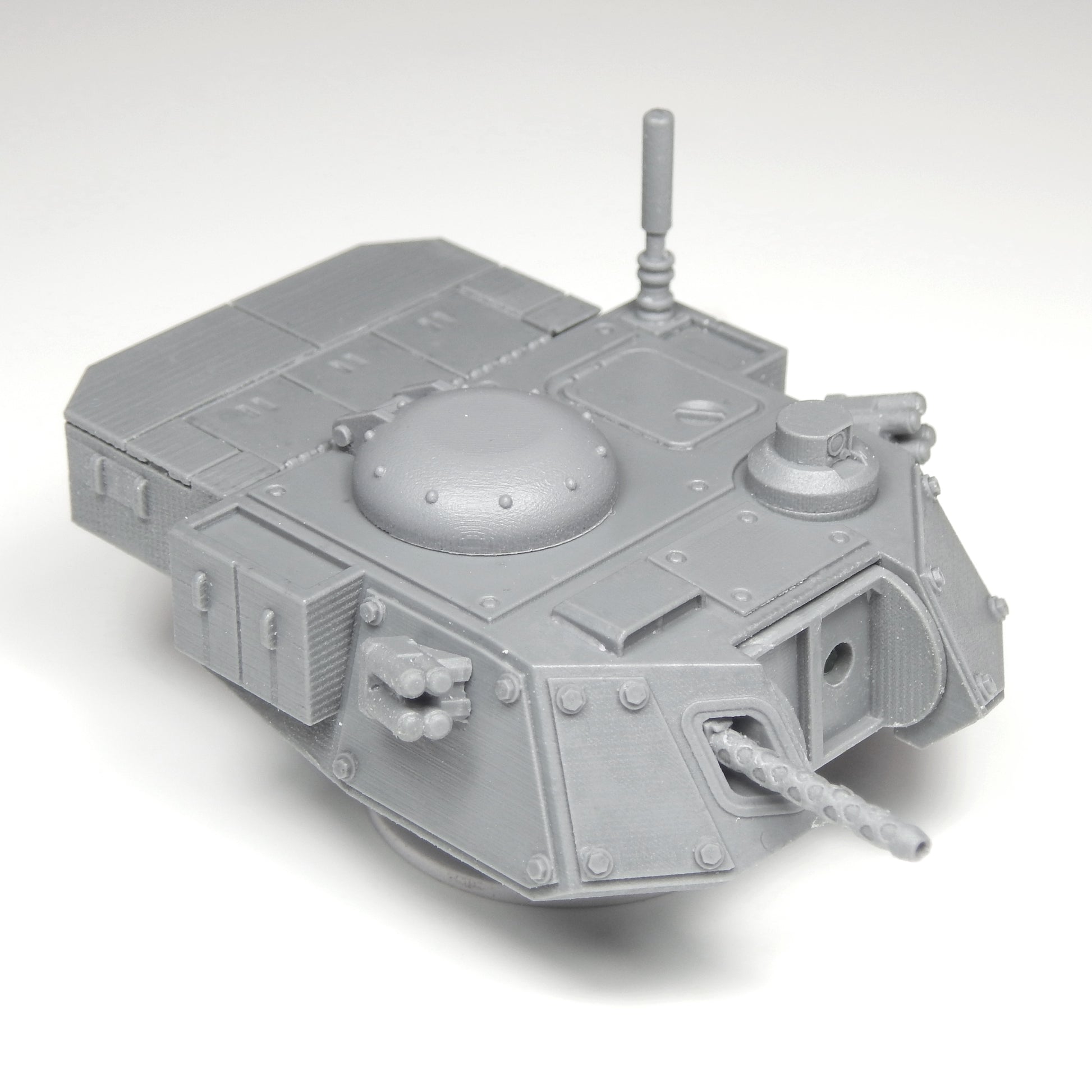 The Roland Dual Weapon Turret is a multi-piece kit that includes the turret, hatch, and weapon mounts. The turret can use any Blood & Skulls Industry Light or Medium Weapon Sets and the weapon mount is pre-drilled for 1/8 inch diameter by 1/16 inch magnets. It is compatiable with Games Workshop Leman Russ plastic model.