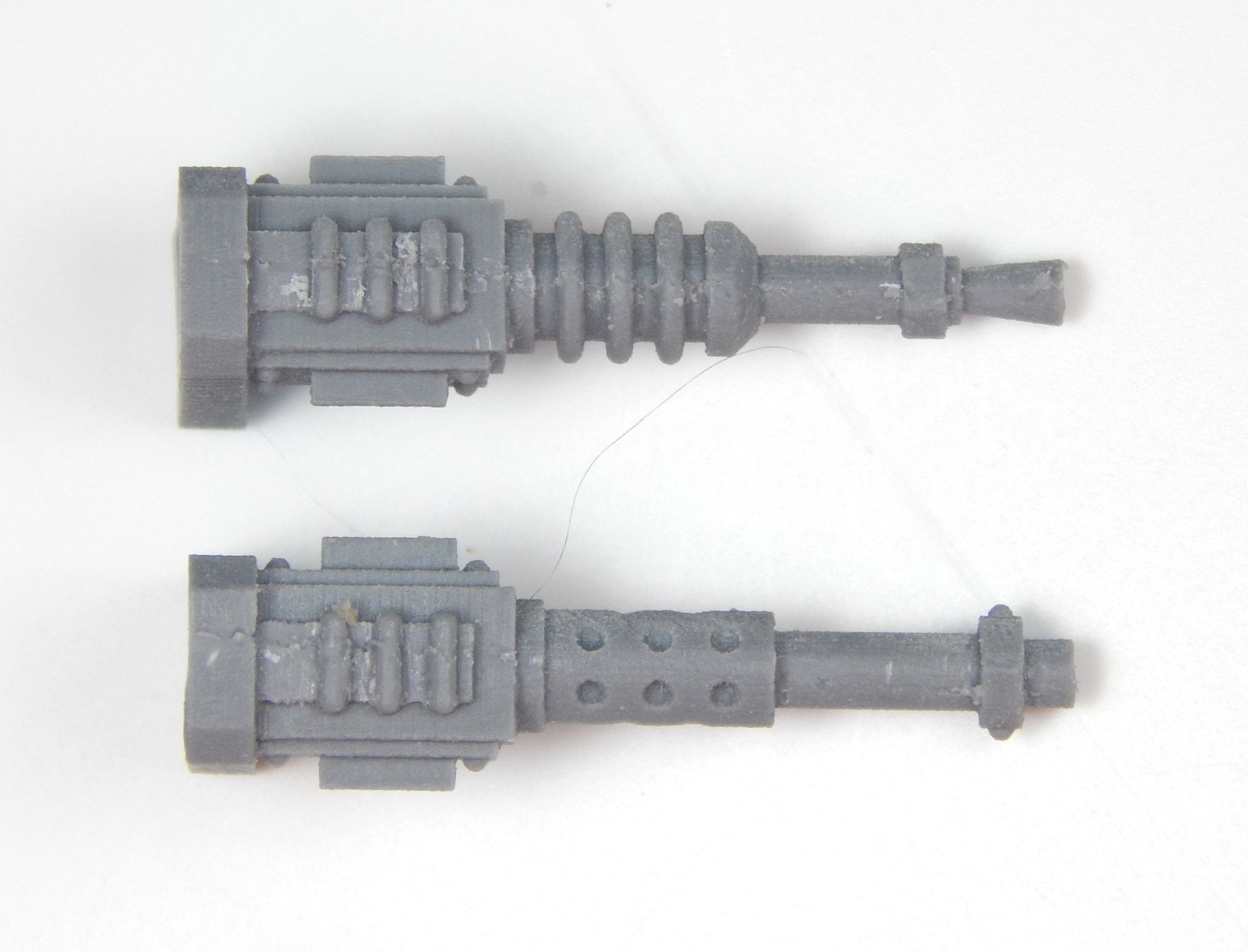 This set consists of two (2) cannons each 1.0 inches (25mm) long mounted on a 0.45 inches (10mm) tall by 0.25 inches (6mm) wide base. The mount can also accommodate a 1/8 inch diameter by 1/16 inch thick magnet allowing easy swapping between weapons.