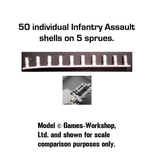 50 spent shell casings on 5 sprues cast in soft metal that fit the 1:48 scale and 28mm Heroic Scale infantry carried assault cannons or mini-guns.